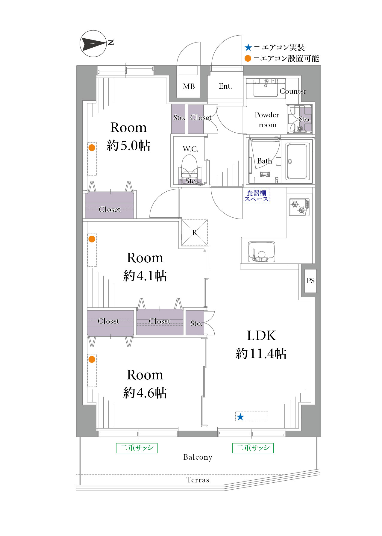 テラス:2.94㎡/エアコン1基/夜間オートロック/駐車場/駐輪場/バイク置場 ※平成23年2月:大規模修繕工事実施済み