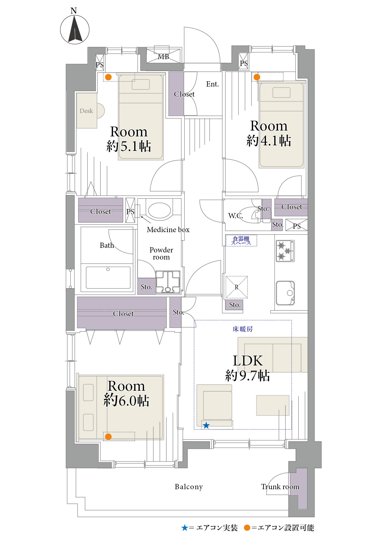 床暖房/エアコン1基/オートロック/宅配ボックス/トランクルーム/駐車場/駐輪場/バイク置場